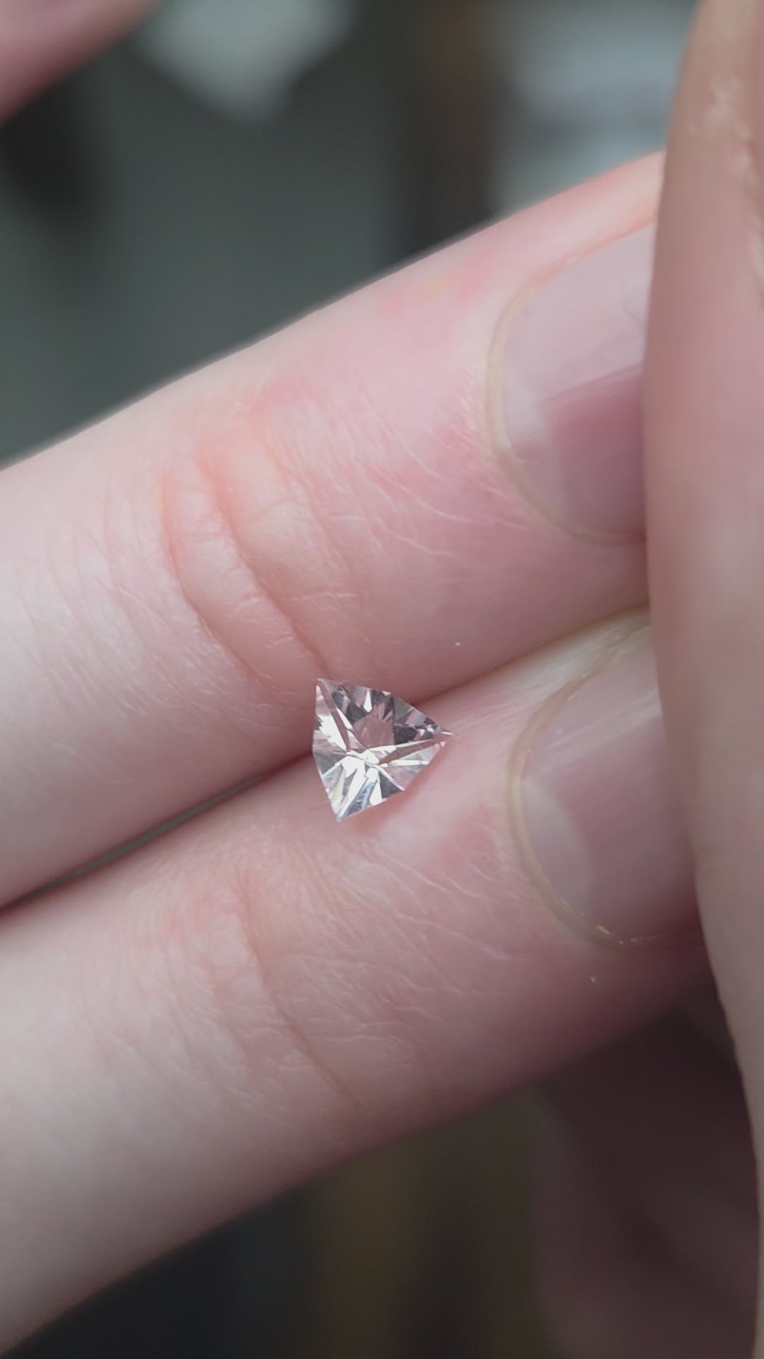 This gemstone was cut by me very very early on the gemcutting journey. It's a very light pale pink that's almost colorless. No inclusions.