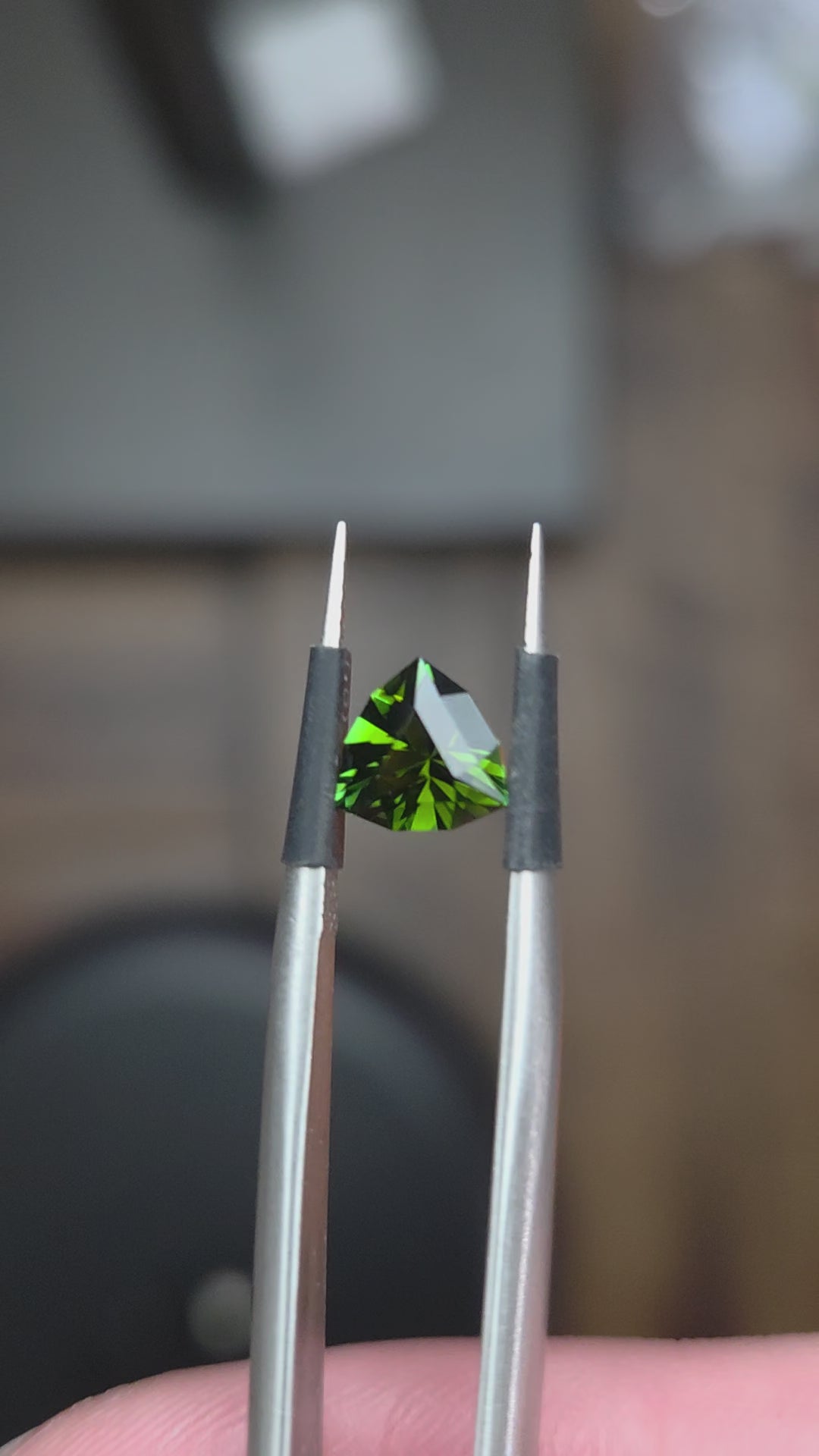 This is a very dark green gemstone with gorgeous clarity. This gem was cut along the C axis of a closed C tourmaline which means it will be dark. However, it still creates an exceptional look with bright green flashes.