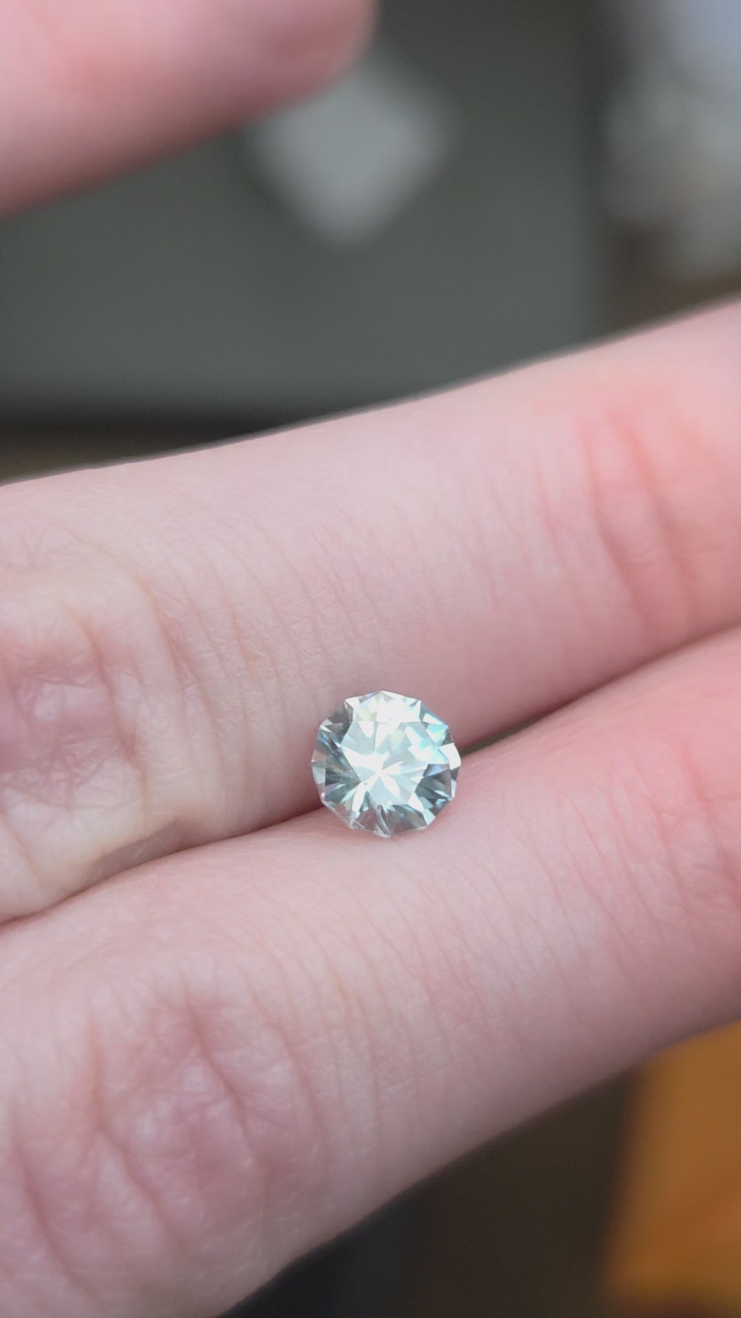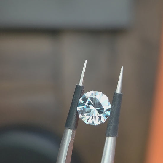 This is a striking zircon round. The color is unique. It is primarily colorless with flashes of blue. Very good clarity.