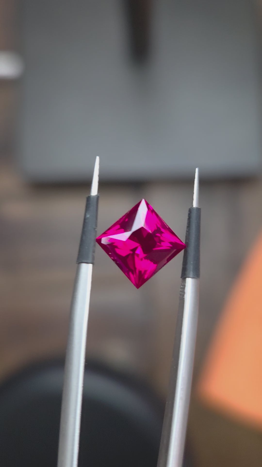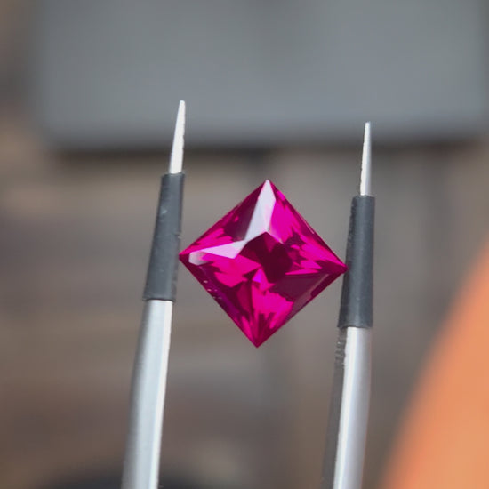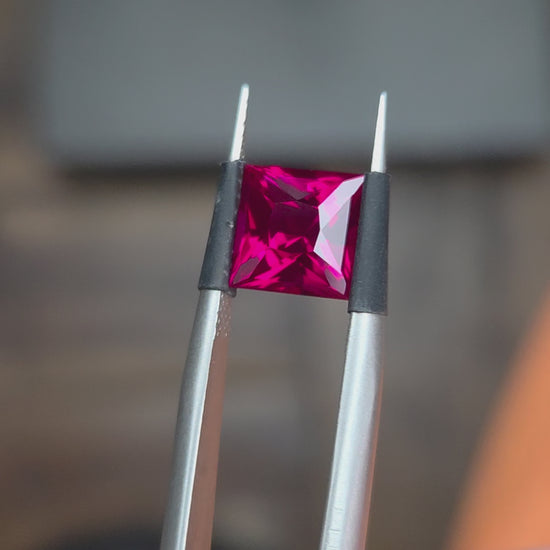 A lovely reddish pink Ruby cut into a custom princess cut square.
