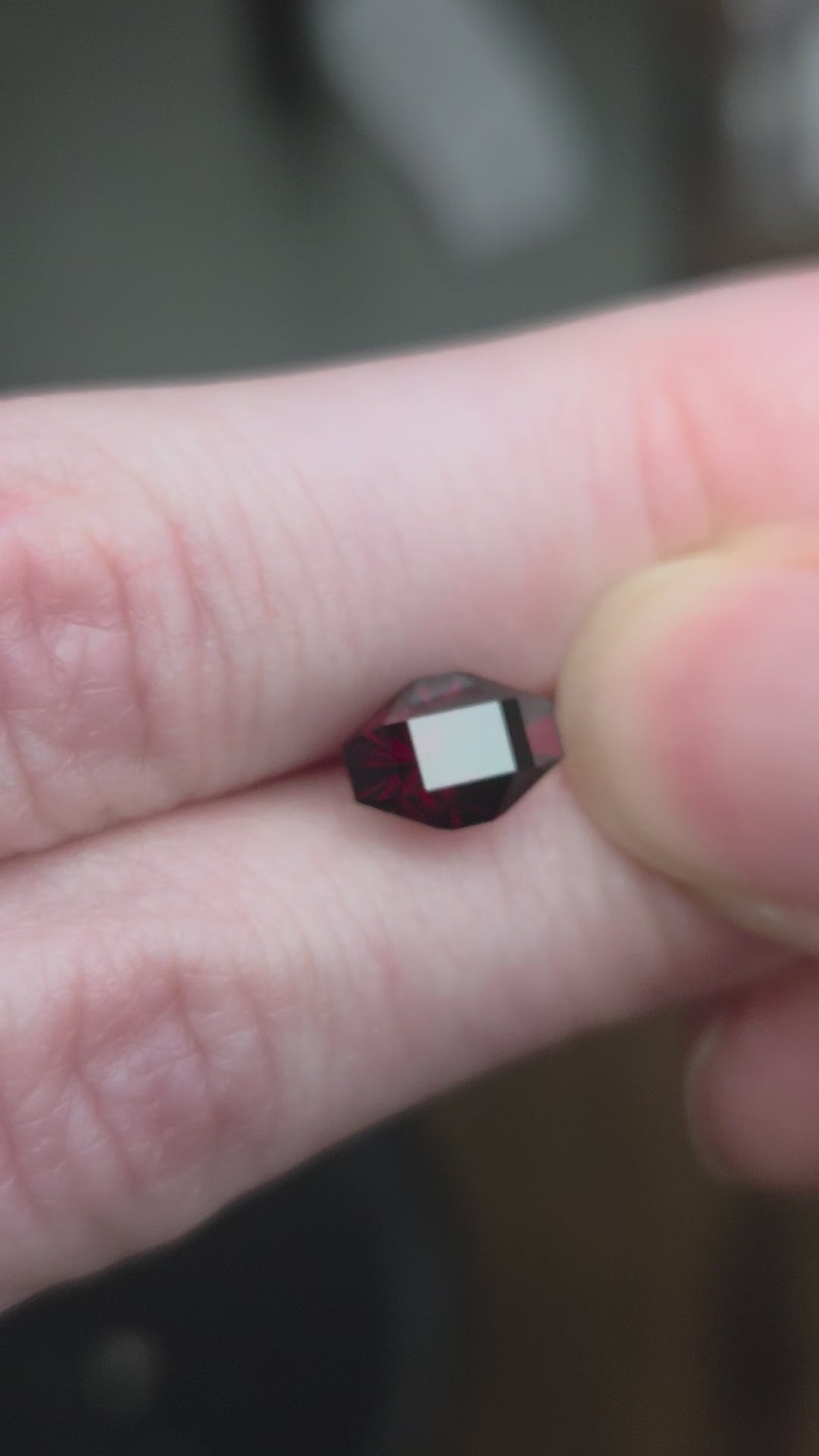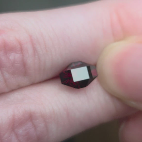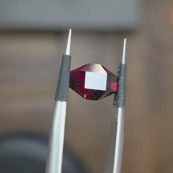2.65 ct precision cut red garnet oval-like gem with flat sides. Custom designed and cut by Julia DeLo.