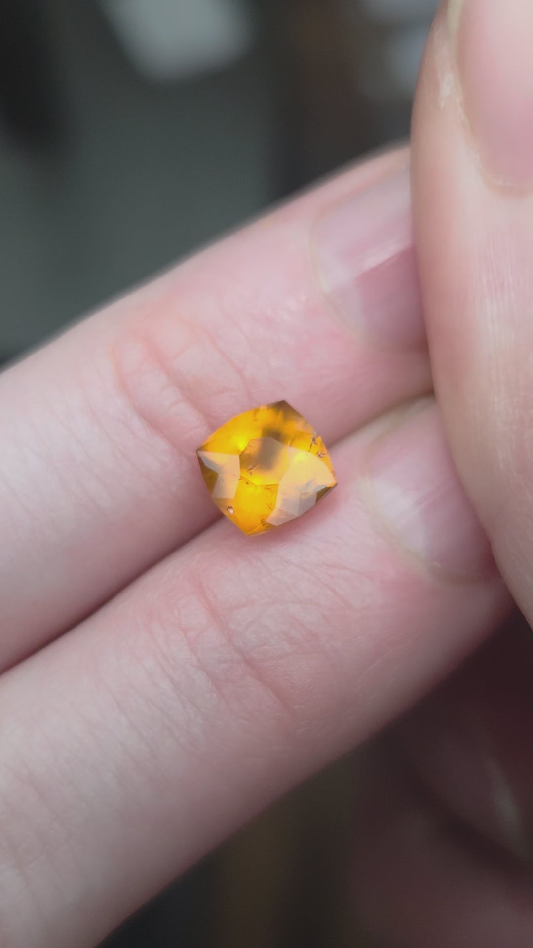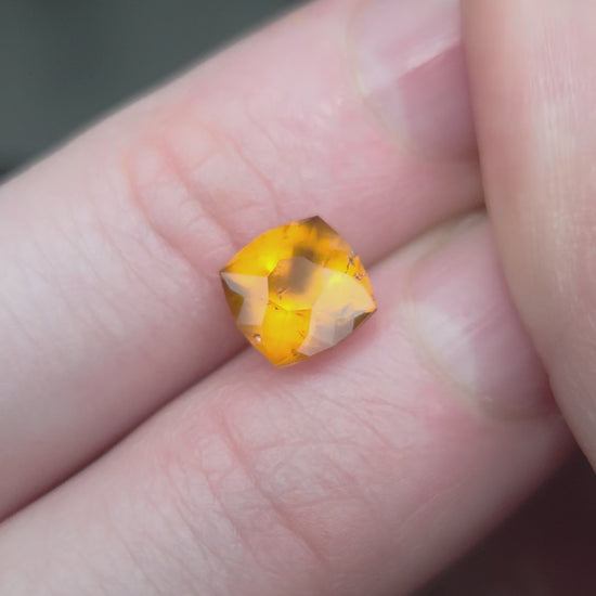 1.71 Ct Semi Opaque Orange Hessonite Garnet Cushion designed and cut by Julia DeLo. This is a very interesting gem as the opacity lets in enough light to let the gem glow. There are some small inclusions scattered in the stone, but no major cracks.